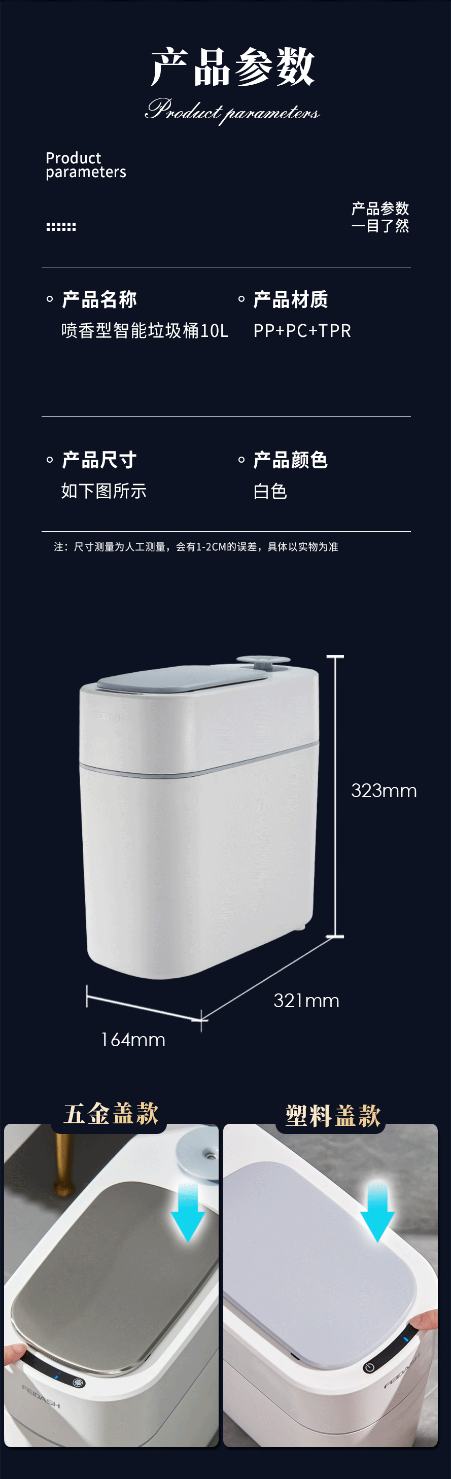 品牌名称:万搏登陆_万搏(中国)三和 生产地区:中国·浙江·台州 万搏登陆_万搏(中国)货号:TG6080 装箱数:1 万搏登陆_万搏(中国)尺寸:32.3x16.4x32.1cm 外箱尺寸:33.5x17.5x33.5cm 条形码:6931643824439 万搏登陆_万搏(中国)三和TG6080 喷香型智能垃圾桶 10L